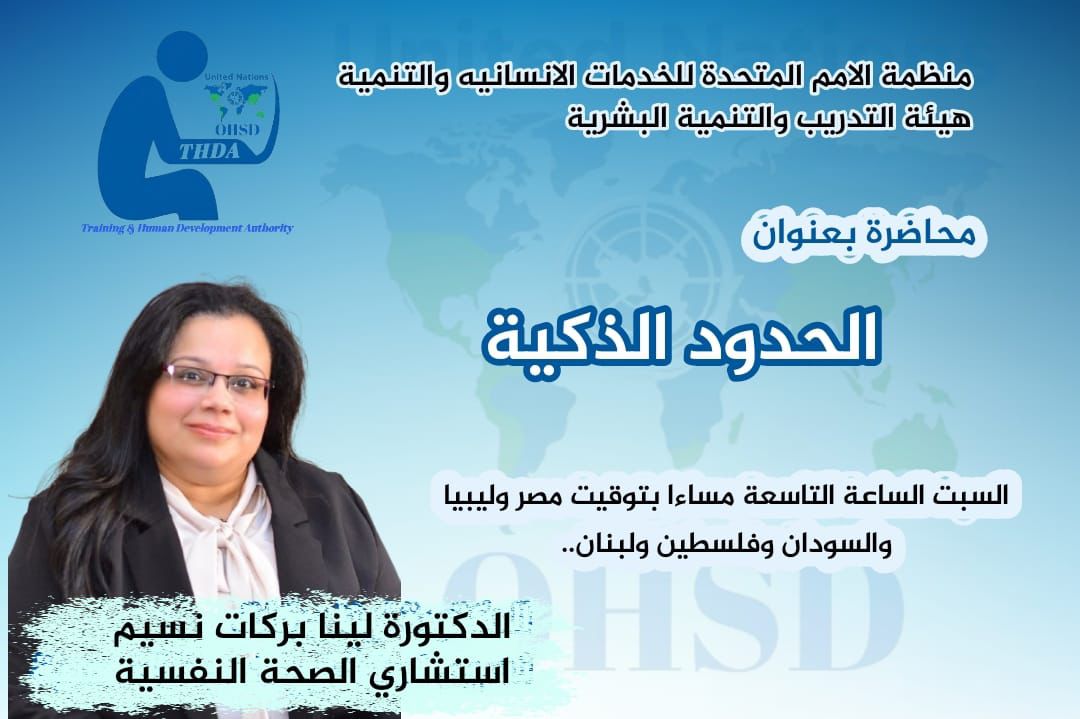 نظّمت الأمم المتحدة للخدمات الإنسانية والتنمية عبر هيئة التدريب والتنمية البشرية محاضرة علمية متميزة بعنوان “الحدود الذكية”، قدمتها الدكتورة لينا بركات نسيم، استشارية الصحة النفسية، وذلك مساء يوم السبت على الساعة التاسعة ليلاً بتوقيت كل من مصر و**ليبيا** و**السودان** و**فلسطين** و**لبنان**.