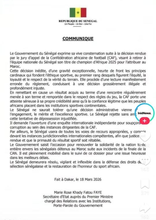 ​في سابقة تثير الكثير من التساؤلات حول الخلط الخطير بين العمل الحكومي والتدبير الرياضي، خرجت الناطقة الرسمية باسم الحكومة السنغالية ببلاغ اتسم بلغة “صدامية”، يهاجم مؤسسات الاتحاد الإفريقي لكرة القدم (الكاف) ويشكك في نزاهتها، وذلك على خلفية قرار لجنة الاستئناف القاضي بمنح لقب كأس أمم إفريقيا 2025 للمنتخب المغربي، إن هذا البلاغ، الذي تجاوز حدود اللباقة الدبلوماسية المعهودة، يستوجب وقفة تحليلية لتصحيح المفاهيم ووضع النقاط على الحروف أمام الرأي العام القاري والدولي.