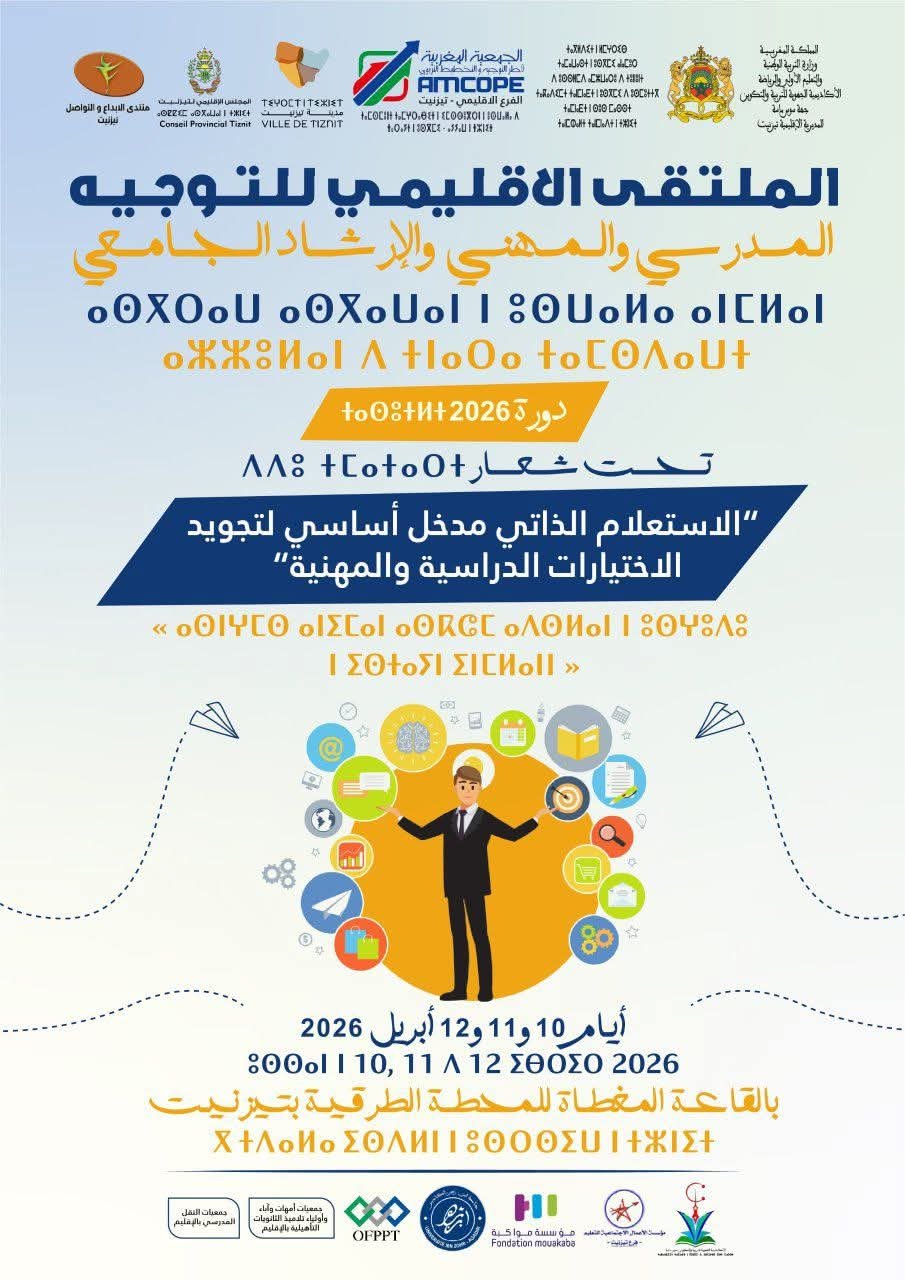 تحت شعار “الاستعلام الذاتي مدخل أساسي لتجويد الاختيارات الدراسية والمهنية”، تنظم المديرية الإقليمية للأكاديمية الجهوية للتربية والتكوين لجهة سوس ماسة بتيزنيت، خلال أيام 10 و11 و12 أبريل 2026، فعاليات الملتقى الإقليمي للتوجيه المدرسي والمهني والإرشاد الجامعي، وذلك بالقاعة المغطاة للمحطة الطرقية بمدينة تيزنيت.