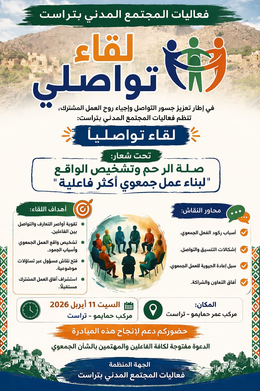 وسيحتضن مركب عمر حمايمو بتراست فعاليات هذا اللقاء يوم السبت 11 أبريل 2026 ابتداء من الساعة الرابعة زوالا حيث من المنتظر أن يشهد حضور عدد من الفاعلين والمهتمين بالشأن الجمعوي إلى جانب مهتمين بقضايا التنمية المحلية والعمل المدني.