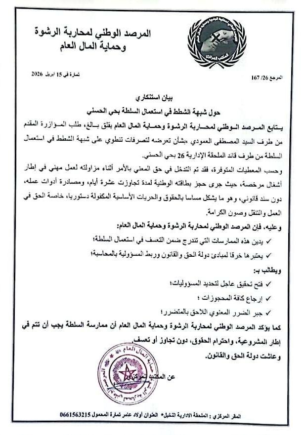ثم يبرز سؤال أكثر حساسية ،هل يمكن أن تتحول عرقلة الأشغال المرخصة إلى مساحة رمادية تزرع فيها شبهات الابتزاز أو سوء استعمال النفوذ؟ هنا، لا يدين البيان واقعة فقط، بل يحذر من منطق كامل قد يتسلل إلى الإدارة حين تغيب الرقابة الفعلية ،لأن الخطر ليس في الخطأ ذاته، بل في قابليته للتكرار.