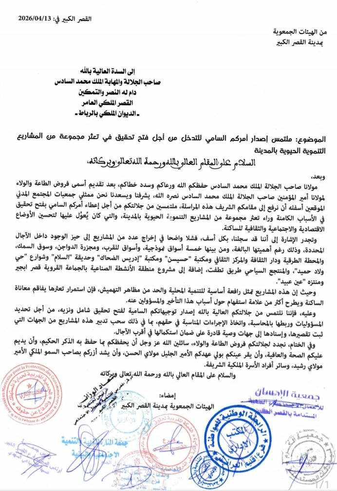 مكتب القصر الكبير _أعادت مراسلة رسمية وجهتها مجموعة من الهيئات الجمعوية بمدينة القصر الكبير إلى جلالة الملك محمد السادس، بتاريخ 20 أبريل 2026 ، ملف تعثر المشاريع التنموية إلى واجهة النقاش المحلي، في خطوة تعكس تصاعد منسوب القلق داخل النسيج المدني بالمدينة.