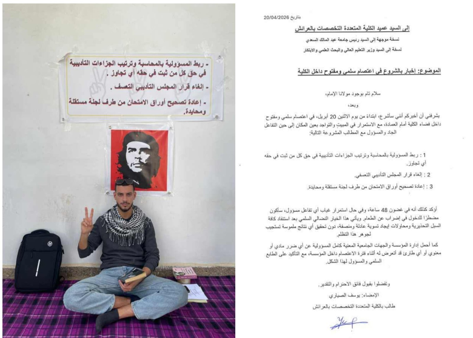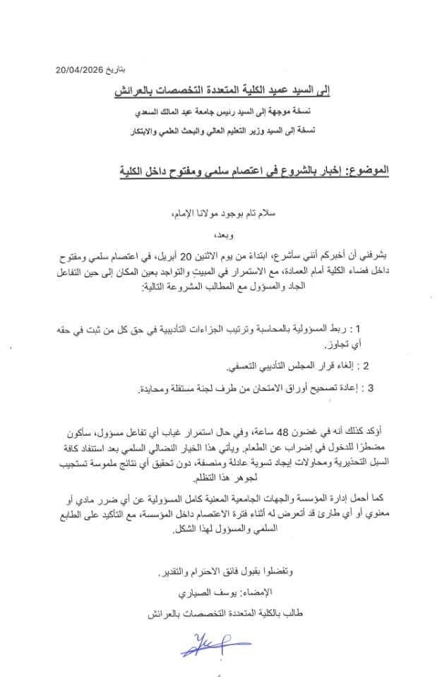 وجه الطالب “يوسف الصباري” بالكلية المتعددة التخصصات بالعرائش التابعة لجامعة عبد المالك السعدي، مراسلة رسمية بتاريخ 20 أبريل 2026 إلى عميد الكلية، مع نسخ موجهة لرئيس الجامعة ووزير التعليم العالي، يُخبره فيها بشروعه ابتداءً من يوم الإثنين 20 أبريل في اعتصام سلمي ومفتوح داخل فضاء الكلية أمام العمادة مع المبيت والتواجد بعين المكان إلى حين التفاعل الجاد مع مطالبه المحددة في ثلاث نقاط: تفعيل ربط المسؤولية بالمحاسبة وترتيب الجزاءات التأديبية في حق كل من ثبت في حقه أي تجاوز، وإلغاء ما وصفه بـ”قرار المجلس التأديبي التعسفي”، وإعادة تصحيح أوراق الامتحان من طرف لجنة مستقلة ومحايدة، مؤكداً أنه يمنح الإدارة مهلة 48 ساعة للتفاعل قبل اللجوء إلى الإضراب عن الطعام كخطوة تصعيدية بعد استنفاده كافة السبل الحوارية، كما حمّل إدارة المؤسسة والجهات الجامعية المسؤولية كاملة عن أي ضرر مادي أو معنوي قد يتعرض له خلال فترة الاعتصام، مشدداً على الطابع السلمي والمسؤول لاحتجاجه، فيما لم يصدر حتى الآن أي تعليق رسمي من إدارة الكلية حول الواقعة.