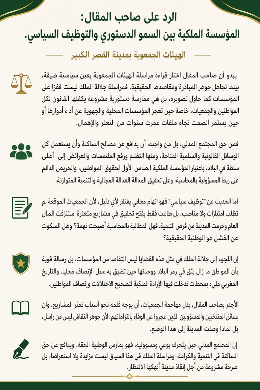 الهيئات الجمعوية بالقصر الكبير ترد على صاحب المقال: “المؤسسة الملكية بين السمو الدستوري والتوظيف السياسي