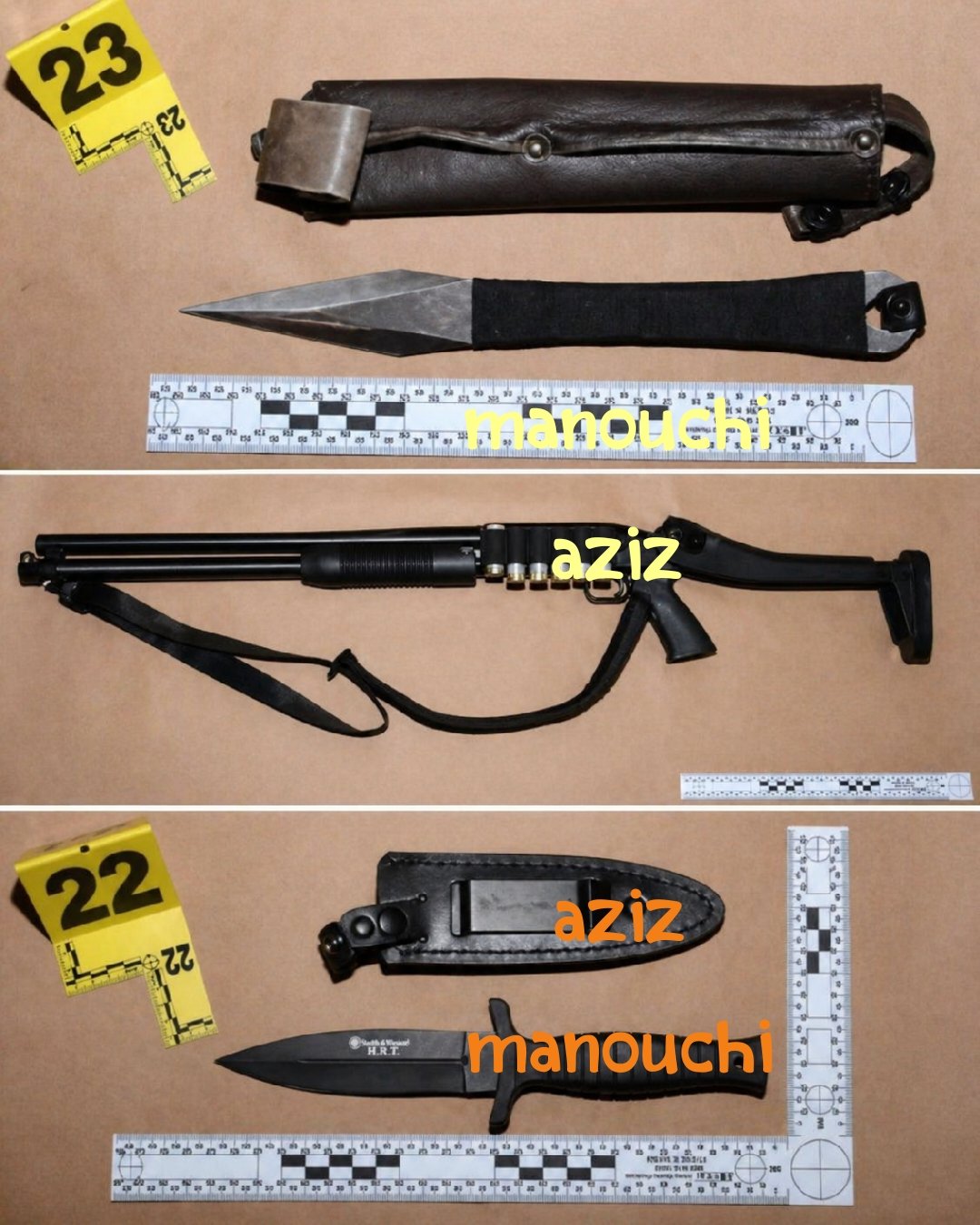وتُظهر الصور أن المشتبه فيه كان مجهزًا ببندقية ضخّة من عيار 12، ومسدس نصف آلي من عيار 38، إلى جانب مجموعة من السكاكين، من بينها شفرة كبيرة ثابتة، فضلاً عن معدات إضافية تم حجزها خلال العملية الأمنية.