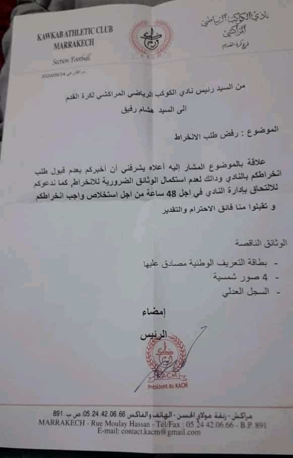 مراكش : أيوب الهداجي على بعد ساعات من الجمع العام لجمعية الكوكب المراكشي فوجئ السيد هشام رفيق المنخرط بصفوف الفريق بإخبار من رئيس نادي الكوكب المراكشي يعلمه بعدم قبول إنخراطه بسبب عدم الادلاء بوثائق الانخراط اللازمة الشيئ الذي فنده السيد هشام رفيق جملة وتفصيلا في إتصال هاتفي مع موقعنا مؤكدا أنه وضع ملف طلب إنخراطه كاملا دون أي نقص مضيفا أن سياسة اللف والدوران التي يمارسها السيد نعيم راضي بصفته رئيس لجنة تصريف وليس رئيسا شرعيا للكوكب المراكشي مؤكدا أنه رفقة باقي أفراد لجنة رضوان حنيش التي قدمت ترشيحها لرئاسة جمعية الكوكب المراكشي أتوا لإتقاذ الفريق براتين قسم الظلمات بعد أن حز في أنفسهم الواقع المر الذي أضحى عليه النادي في وقت كان يضرب لفارس النخيل ألف حساب محليا وقاريا خلال فترات خلت مردفا ” قدمنا الدعم المادي والمعنوي للفريق منذ بداية الموسم لكن القرارات المتهورة لرئيس الفريق هي من أقبعت الفريق في جملة المشاكل كيف يعقل لفريق عريق ينافس على الصعود للقسم الاول أن يفرط في أجود لاعبيه لفريق منافس بنفس الدرجة فإن كان نعيم راضي عاجزا عن توفير موارد مالية أو فشل في تسيير فريق بقيمة الكوكب المراكشي فالاستقالة أولى من أن يمرمغ إسم الكوكب الذي يسير على خطى نوادي كانت في ما مضى من أقوى الفرق بالمغرب ”