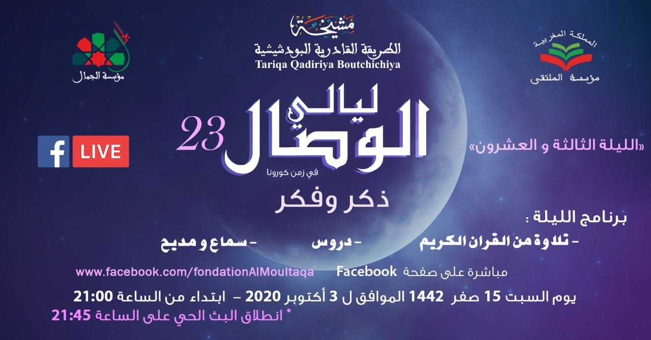 تقوى الله عز وجل، ومراقبة النفس ويقظة الضمير، والإيحاءات التعريفية والغايات المعرفية للتصوف، وقواعده، هي اهم محاور الليلة الثالثة والعشرين من سلسلة ليالي الوصال الإفتراضية التي نظمتها مشيخة الطريقة القادرية البودشيشية، ومؤسسة الملتقى بشراكة مع مؤسسة الجمال، السبت 03 أكتوبر الجاري، عبر الصفحة الرسمية لمؤسسة الملتقى بموقع التواصل الاجتماعي “فيسبوك”.