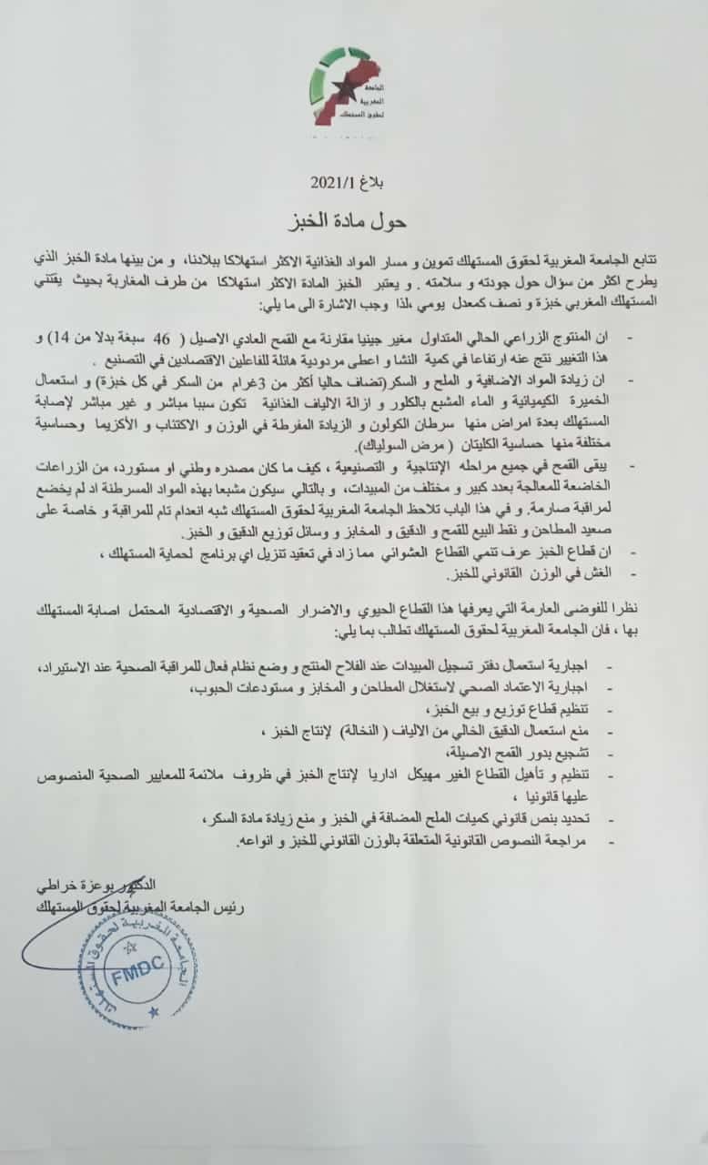 ودعت الجامعة المغربية لحماية المستهلك التي يوجد على رأسها الدكتور بوعزة الخراطي، والحاصلة على صفة عضو بمجلس المنافسة، إلى التسريع باتخاذ مجموعة من التدابير لتنظيم قطاع صناعة الخبز، وإجراءات زجرية، لمحاربة المخالفين، حماية لصحة المستهلكين.