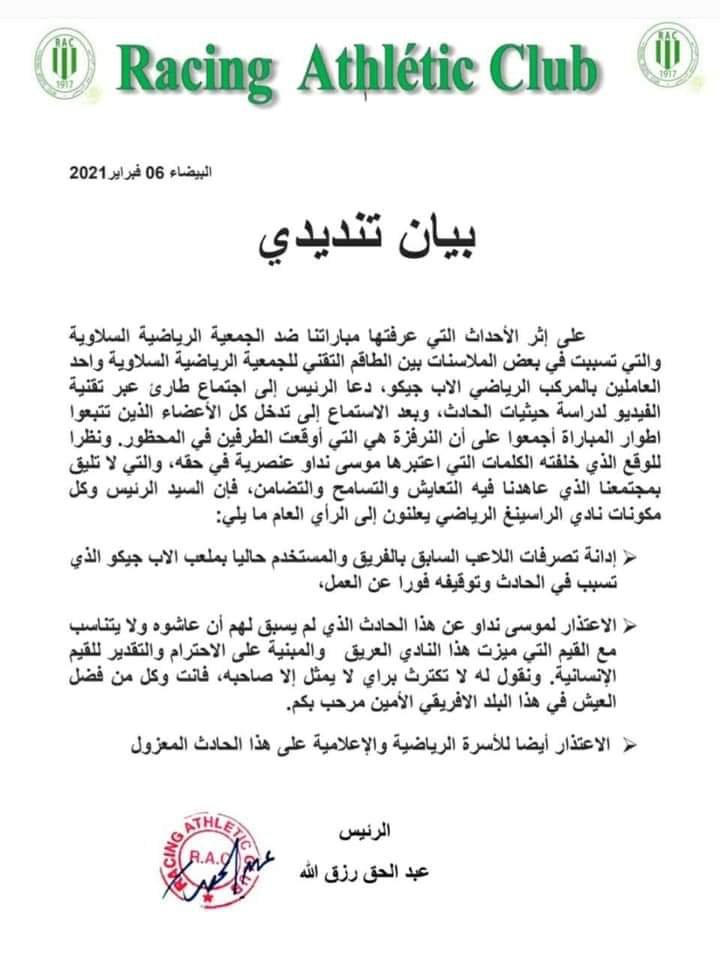 أصدر فريق الراسينغ الرياضي ، بيانا حول الواقعة التي تعرض لها مدرب فريق جمعية سلا السنغالي موسى نداو ، خلال المباراة التي جمعت الفريقين ، يوم أمس السبت، لحساب الجولة التاسعة من البطولة الاحترافية “إنوي” القسم الثاني .