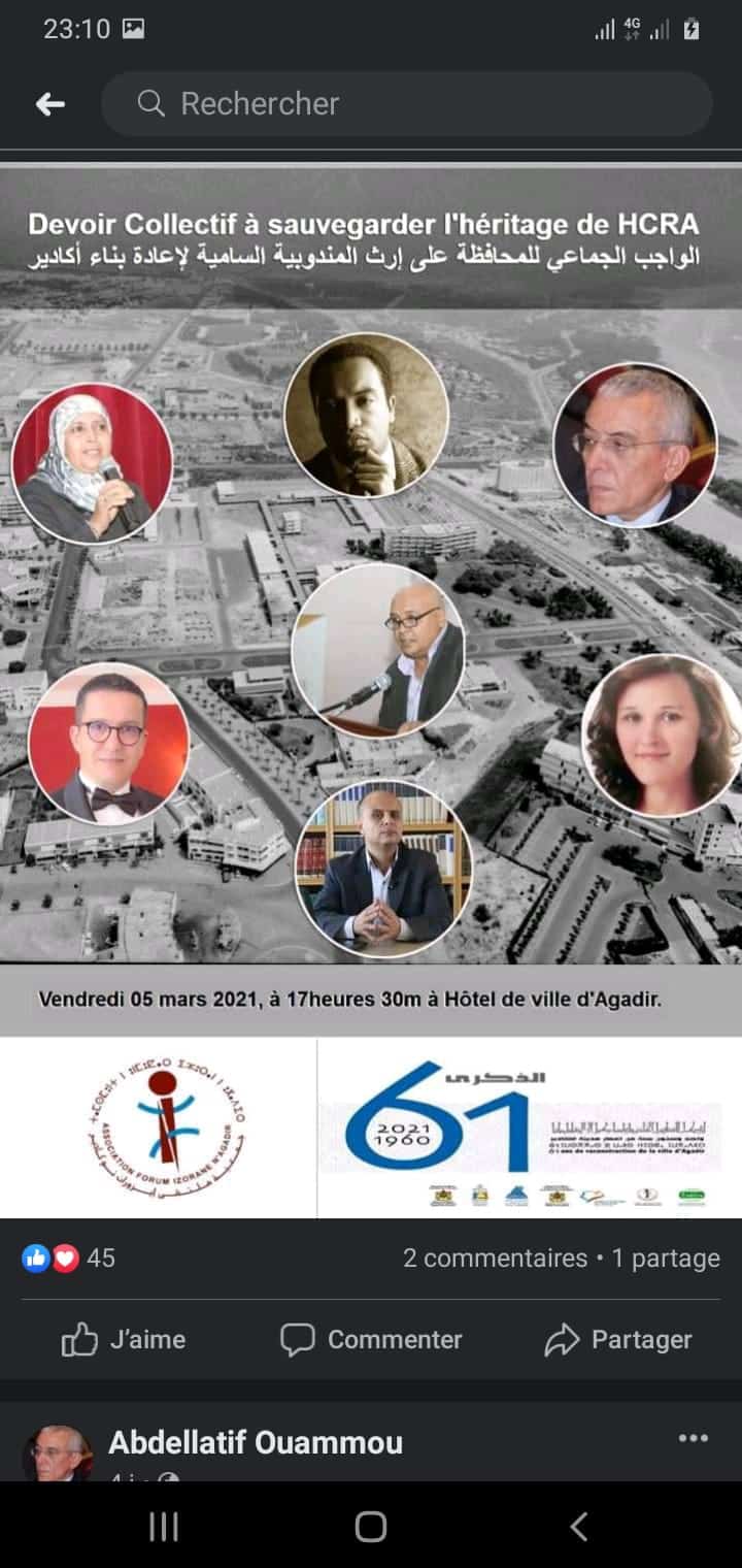 ومدينة أكادير تزخر بكنوز معمارية متنوعة، لكونها متحفا معماريا مفتوحا، كما تصوره الرواد المؤسسون، من خلال المفوضية العليا لإعادة إعمار أكادير (HCR)، والتي تم وأدها في المهد، مع حلول سنة 1972، وهي التي تركت لنا تراثا ماديا فريدا يشكل خصوصية معمارية ويمنح هوية لأكادير بعد الزلزال، ب قيمة بناياته الجمالية والوظيفية، من خلال الوجود القوي للخرسانة الخام للمباني، وبالتعبيرات الهندسية والخطوط الصارمة، التي أراد مصمموا البنايات من خلالها أن يعكسوا الجانب الوظيفي باعتماد أشكال وأنماط البساطة في المعمار والجمال في الشكل .