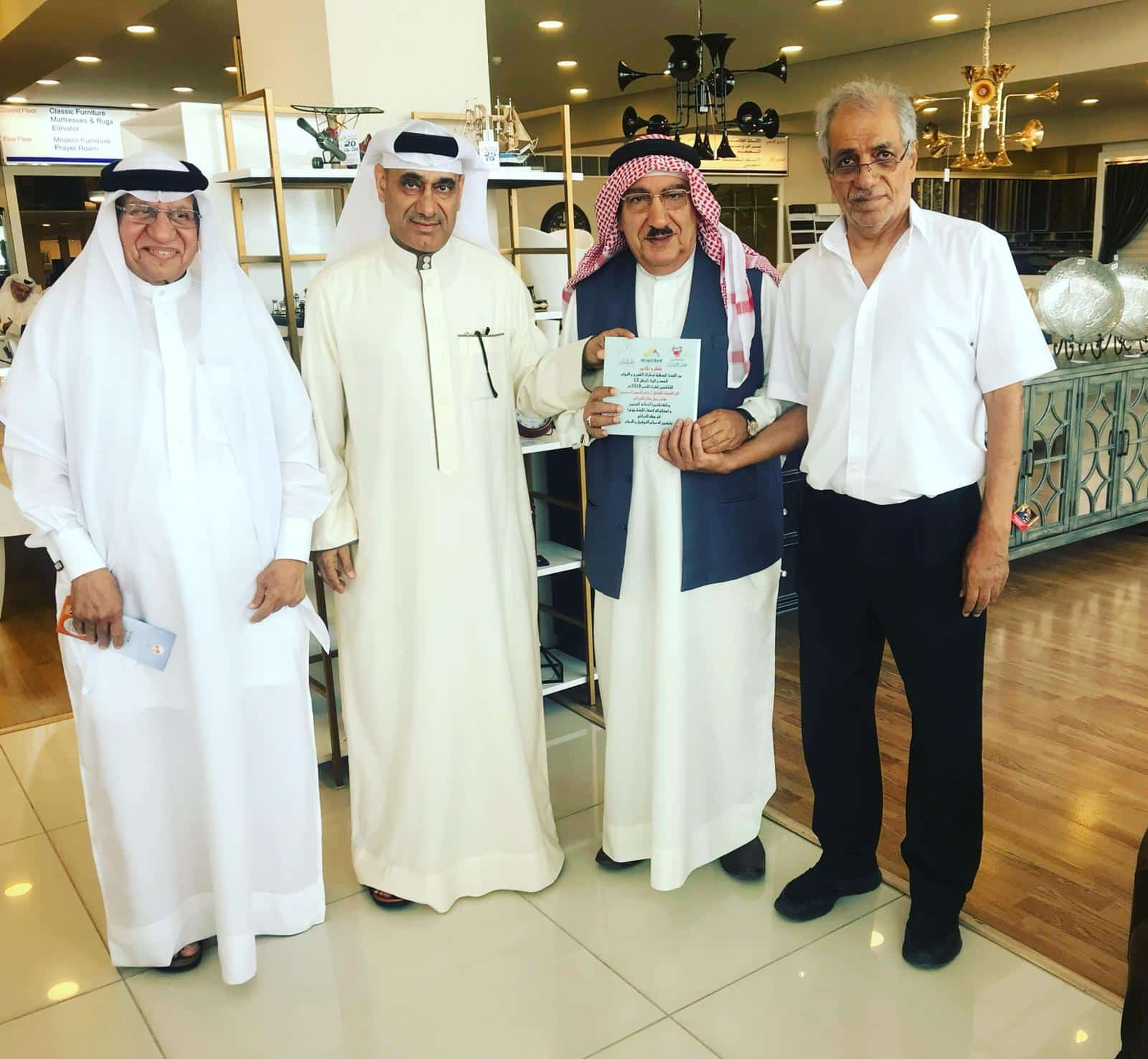 هذا ماجرى بمقر مفروشات احمد شريف بمملكة البحرين تم تكريم الفنان التراثي الكبير الاستاذ صالح الحسن بو عبد الناصر على تميزه بالتراث الوطني بالمملكة البحرينية وخارجها وبتواجد أيضا الاستاذ يوسف الساعاتي بومحمد وذلك بحضور الاستاذ عبد الرحمن شريف مدير عام مفروشات احمد شريف وبمعيه الداينمو و الرياضي الكبير الاستاذ عمران النجداوي نائب رئيس الاتحاد البحريني للجمباز سابقا مدير الانشطة الرياضية بمفروشات احمد شريف الذي يولي إهتمامات بالغا في المتابعة والقيام بالجهود الجباره للتنسيق مع الشخصيات الوطنية التي تستحق التكريم والتقدير والثناء على مايقدموه من إبداعات للوطن – متمنيا الموفقية لكل مجاهد من أبناء المملكة البحرين الغالية .