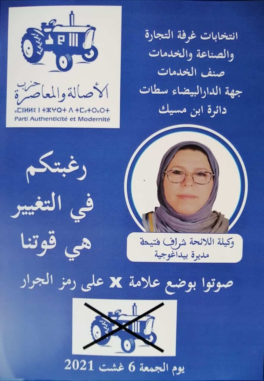 من بين الوجوه الجديدة، التي أعلنت إستعدادها لدخول غمار الاستحقاقات الغرف المهنية لغرفة الصناعة و التجارة لأول مرة بإسم حزب الأصالة و المعاصرة  على مستوى عمالة مقاطعات ابن مسيك  صنف الخدمات الأستاذة شراف فتيحة مديرة بيداغوجية و صاحبة مدرسة خاصة للحلاقة ..