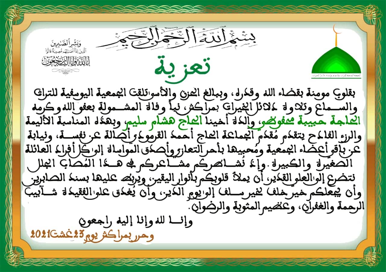 و على إثر هذا المصاب الجلل يتقدم رئيس الجمعية اليوسفية الحاج أحمد القرمودي أصالة عن نفسه ونيابة عن باقي اعضائها ومنخرطيها والمحبين بأحر التعازي وأصدق المواساة للأخ العزيز هشام سليم ولأسرته الصغيرة والكبيرة وكل من فجع فيها، راجين من العلي القدير أن يرزقهم الصبر والسلوان، وأن يدخل المرحومة جنة أعلى عليين مع النبيين والصديقين والشهداء والصالحين وحسن أولئك رفيقا، وإنا لله وإنا إليه راجعون.