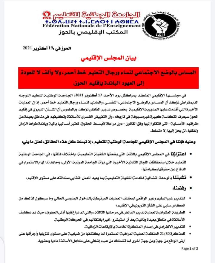 اصدر المجلس الاقليمي للجامعة الوطنية للتعليم التوجه الديمقراطي FNE بالحوز بيانا اليوم؛ ضد التدبير العشوائي للدخول الدراسي و الايقاعات الزمنية الانفرادية وحسب نفس البيان الذي توصلت هنا 24 بنسخة منه؛ سيتم تسطير برنامج نضالي تصعيدي من اجل الدفاع عن المدرسة العمومية. من خلال معركة اسماها البيان بمعركة الكرامة.