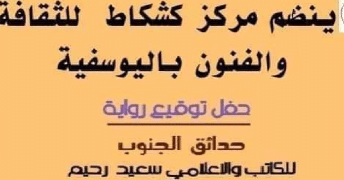 ينظم مركز كشكاط للثقافة والفنون باليوسفية حفل توقيع رواية حدائق الجنوب للكاتب والاعلامي سعيد رحيم يسيره ويقدمه ذ المحجوب ححان بمشاركة ذ عبد الرحمان شكيب رئيس نادي القلم المغربي فرع اسفي يتكلف بالقراءة النقدية وكذا مشاركة كل من الفنان حمزة بولان والفنان محمد التائب المكلفان بالتنشيط الموسيقي .