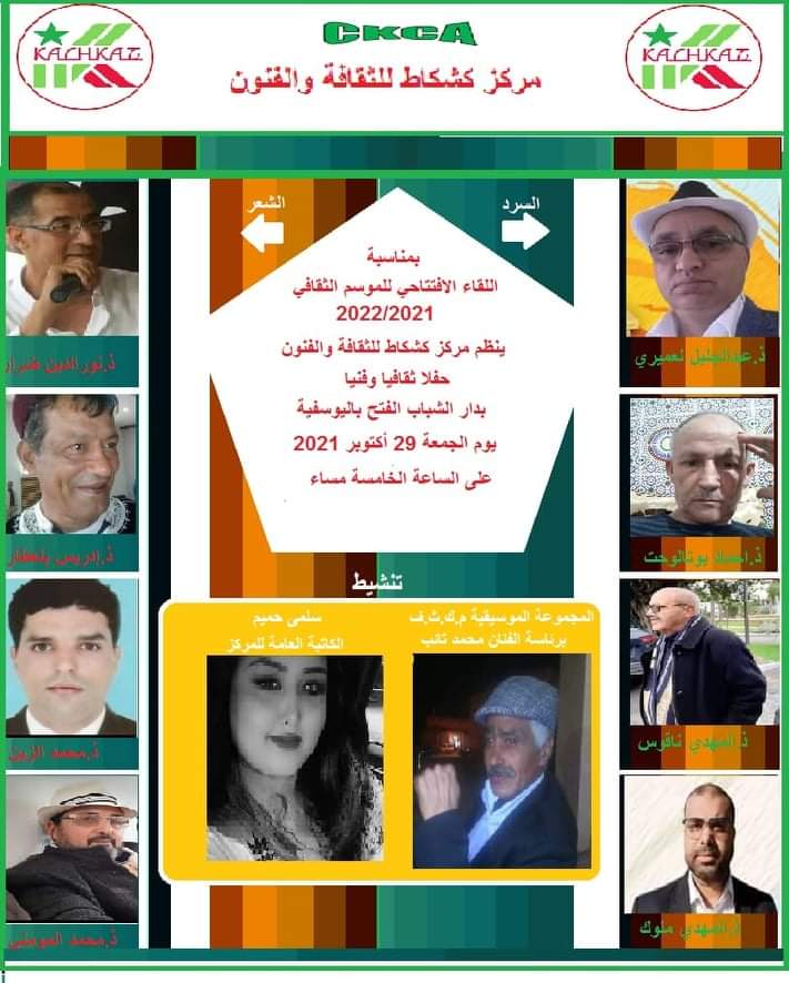 وفي نفس اليوم بمناسبة اللقاء الافتتاحي للموسم الثقافي 2021/2022 ينظم مركز كاشكاط للثقافة والفنون حفلا ثقافيا وفنيا وذلك بدار الشباب الفتح بمدينة اليوسفية يوم الجمعة 29 اكتوبر 2021 على الساعة الخامسة مساء بحضور رجال الشعر والسرد امثال ذ ادريس بلعطار ،ذ محمد المومني ،ذ المهدي ناقوس ،ذ عبد الجليل لعميري ،ذ احمد بوتالوحت ،و ذ المهدي ملوك