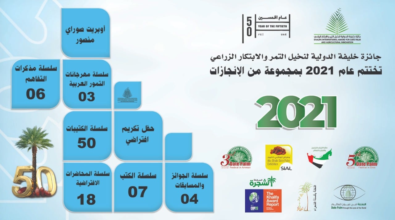 كما صدر عن الأمانة العامة للجائزة في العام الماضي عدد من الكتب العلمية التي أَثْرَتِ المكتبة العربية والدولية مثل كتاب ضمن البحوث المشاركة في الندوة العلمية المرافقة للمهرجان الدولي الثاني للتمور الأردنية 2019، وكتاب بعنوان “المحفزات الحيوية من أجل الاستدامة الزراعية في النظام البيئي لواحات النخيل” باللغة الإنجليزية، تناول فيه مرض البيوض والجفاف والملوحة وقلة المادة العضوية بالتربة ومحتواها المعدني، حيث يمكن معالجة هذه المشاكل من خلال استخدام الأسمدة الحيوية في إنتاج المحاصيل المستدامة. وكتاب “دراسة متكاملة للإنجازات والآثار المتعددة لجائزة خليفة الدولية لنخيل التمر والابتكار الزراعي على المستوى المحلي والإقليمي والدولي، أعدته شركة هيل للاستشارات الزراعية، وكتاب أمراض وآفات نخيل التمر، بالإضافة إلى الكتاب السنوي للجائزة 2021، إلى جانب ذلك فقد أصدرت الأمانة العامة للجائزة تقريراً علمياً دولياً بعنوان “تجسير الحدود 2021″، يركز الكتاب على كيف يمكن للتعاون الإقليمي الحيوي تحويل صناعة نخيل التمر إلى نموذج ناجح للاقتصاد الدائري. صدر التقرير احتفالاً بذكرى عقد الأمم المتحدة لاستعادة النظام البيئي (2021-2030)، بمساهمة من 46 جهة ومنظمة دولية وعدد من الخبراء يمثلون 21 دولة بالعالم. حيث تم إطلاق التقرير في قمة العمل المناخي الدولية فغلاسكو بالمملكة المتحدة، بتاريخ 06 نوفمبر 2021 ضمن فعاليات الوفد الرسمي لدولة الإمارات العربية المتحدة. إلى جانب ذلك فقد صدر عن الأمان العامة للجائزة عددين من مجلة الشجرة المباركة الأول في شهر مارس والثاني في شهر أكتوبر 2021 بمشاركة نخبة من الباحثين والأكاديميين العرب والأجانب المختصين بزراعة النخيل وإنتاج التمور.