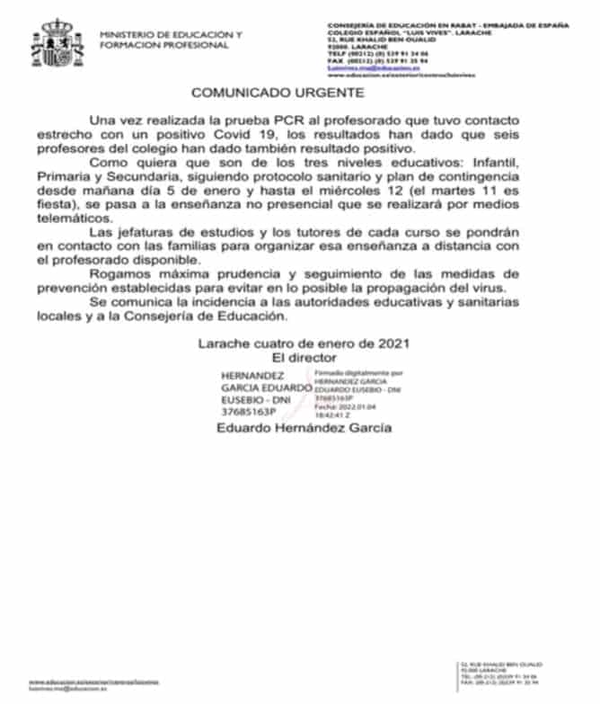 أغلقت المدرسة الإسبانية بالعرائش “لويس بيبيس” قد أعلنت عن تمديد إغلاق المؤسسة بسبب فيروس كوفيد 19. وحسب مصادر جريدة “هنا 24″، فإن إدارة المؤسسة اشتبهت بإصابة عدد من أطرها بالفيروس، بعد مخالطتهم لأحد المصابين من خارج المؤسسة، وأعلنت عن إغلاق وتوقيف الدراسة اليوم الثلاثاء 4 يناير الجاري.