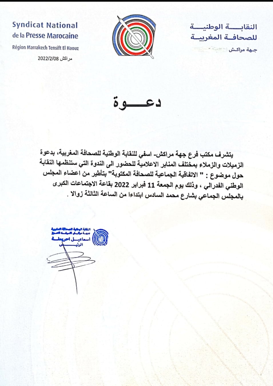 الاتفاقية الجماعية للصحافة المكتوبة”موضوع ندوة ينظمها الفرع المحلي للنقابة الوطنية للصحافة فرع مراكش يوم الجمعة 11 فبراير  2022