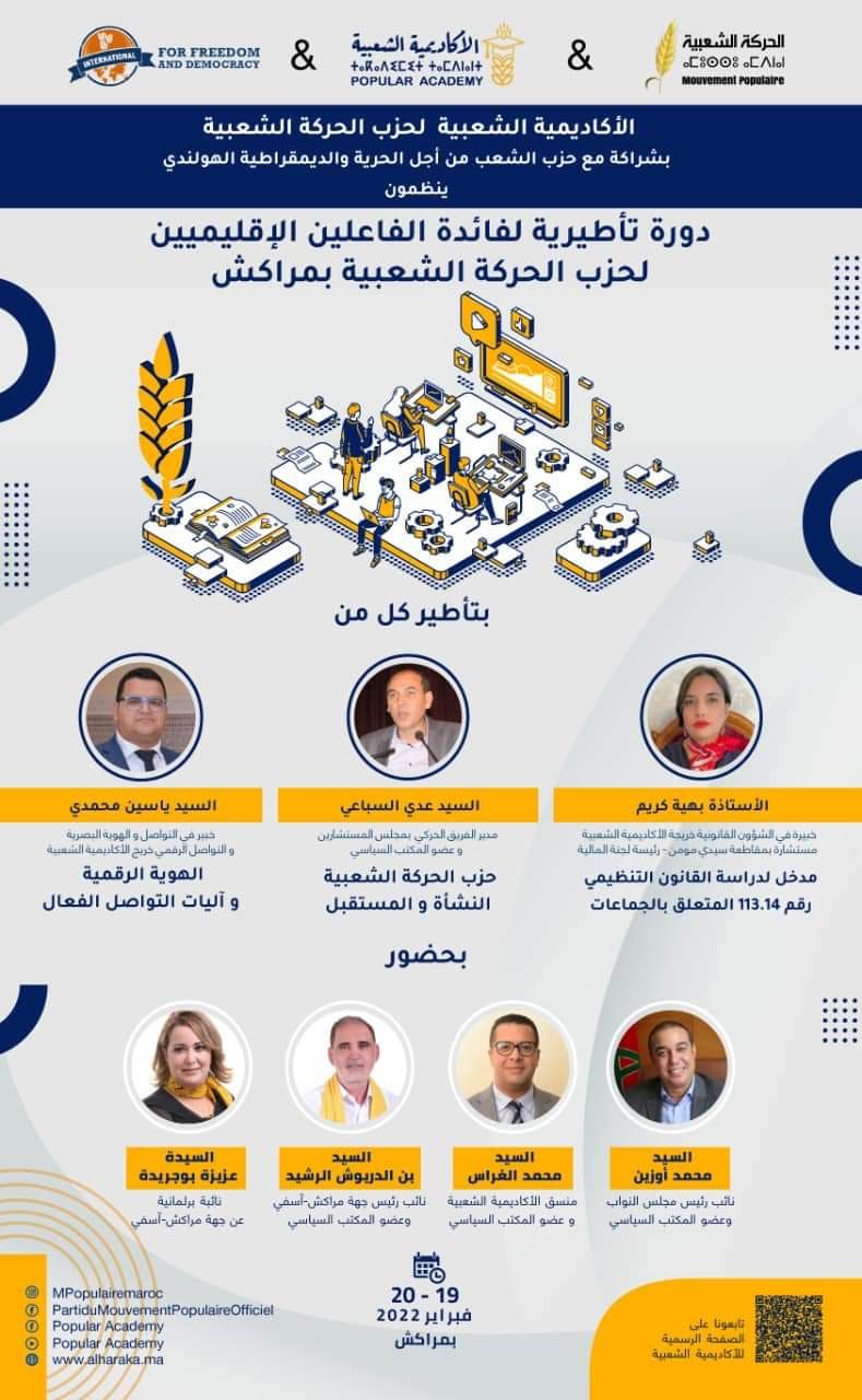 نشاط حزبي/ الأكاديمية الشعبية لحزب الحركة الشعبية بشراكة مع حزب الشعب من أجل الحرية والديمقراطية الهولندي ينظمون دورة تأطيرية لفائدة الفاعلين الإقليميين لحزب الحركة الشعبية بمراكش