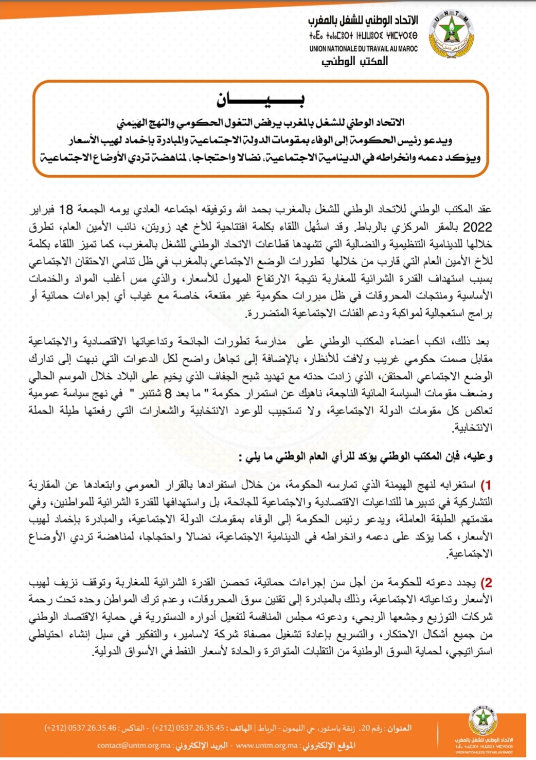 1) استغرابه لنهج الهيمنة الذي تمارسه الحكومة، من خلال استفرادها بالقرار العمومي وابتعادها عن المقاربة التشاركية في تدبيرها للتداعيات الاقتصادية والاجتماعية للجائحة، بل واستهدافها للقدرة الشرائية للمواطنين، وفي مقدمتهم الطبقة العاملة، ويدعو رئيس الحكومة إلى الوفاء بمقومات الدولة الاجتماعية، والمبادرة بإخماد لهيب الأسعار، كما يؤكد على دعمه وانخراطه في الدينامية الاجتماعية، نضالا واحتجاجا، لمناهضة تردي الأوضاع الاجتماعية.
