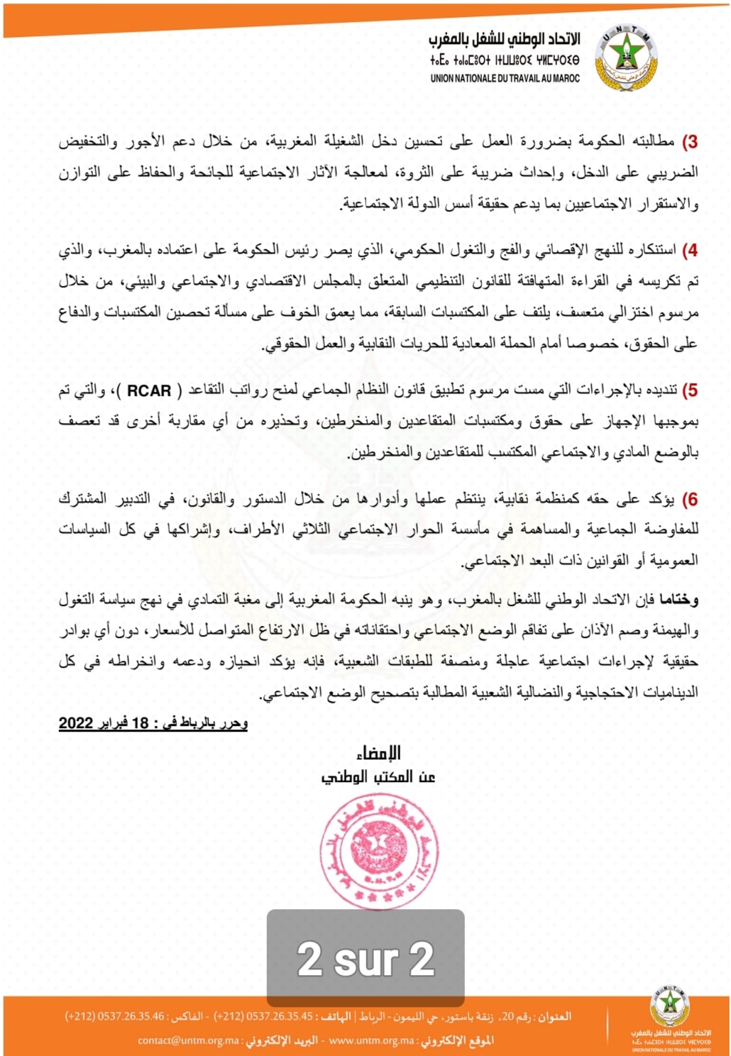 وختاما فإن الاتحاد الوطني للشغل بالمغرب، وهو ينبه الحكومة المغربية إلى مغبة التمادي في نهج سياسة التغول والهيمنة وصم الآذان على تفاقم الوضع الاجتماعي واحتقاناته في ظل الارتفاع المتواصل للأسعار، دون أي بوادر حقيقية لإجراءات اجتماعية عاجلة ومنصفة للطبقات الشعبية، فإنه يؤكد انحيازه ودعمه وانخراطه في كل الديناميات الاحتجاجية والنضالية الشعبية المطالبة بتصحيح الوضع الاجتماعي.