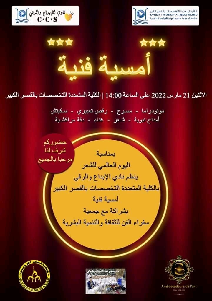 بمناسبة اليوم العالمي للشعر ينظم نادي الإبداع والرقي بالقصر الكبير أمسية فنية بشراكة مع جمعية سفراء الفن للثقافة والتنمية البشرية