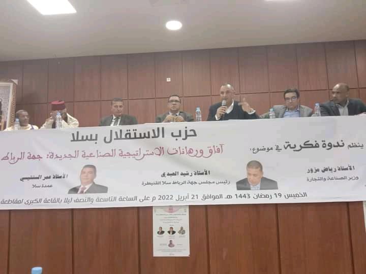 نظم حزب الاستقلال بوم الجمعة 21 أبريل 2022 مساءا بالقاعة الكبرى لمقاطعة العيايدة سلا ندوة فكرية حول افاق الاستراتيجية الصناعية الجديدة بجهة الرباط سلا القنيطرة وبمشاركة الأستاذ زياد رياض وزير الصناعة والتجارة والأستاذ رشيد العبدي رئيس مجلس جهة الرباط سلا القنيطرةوالأستاذ عمر السنتيسي عمدة مدينة سلا.تطرق الاساتذة الحاضرون الى مجموعة من النقط المهمة من بينها خلق مشاريع كبرى وجلب مستثمرين خاصة بالصناعة لتشغيل جميع الشرائح وكيفية تطوير ودراسة هذه المشاريع مع مؤسسات الدولة وتنزيلها على أرض الواقع كمنطقة الصناعية ااجديدة بسيدي بوقنادل سلا نموذجا.