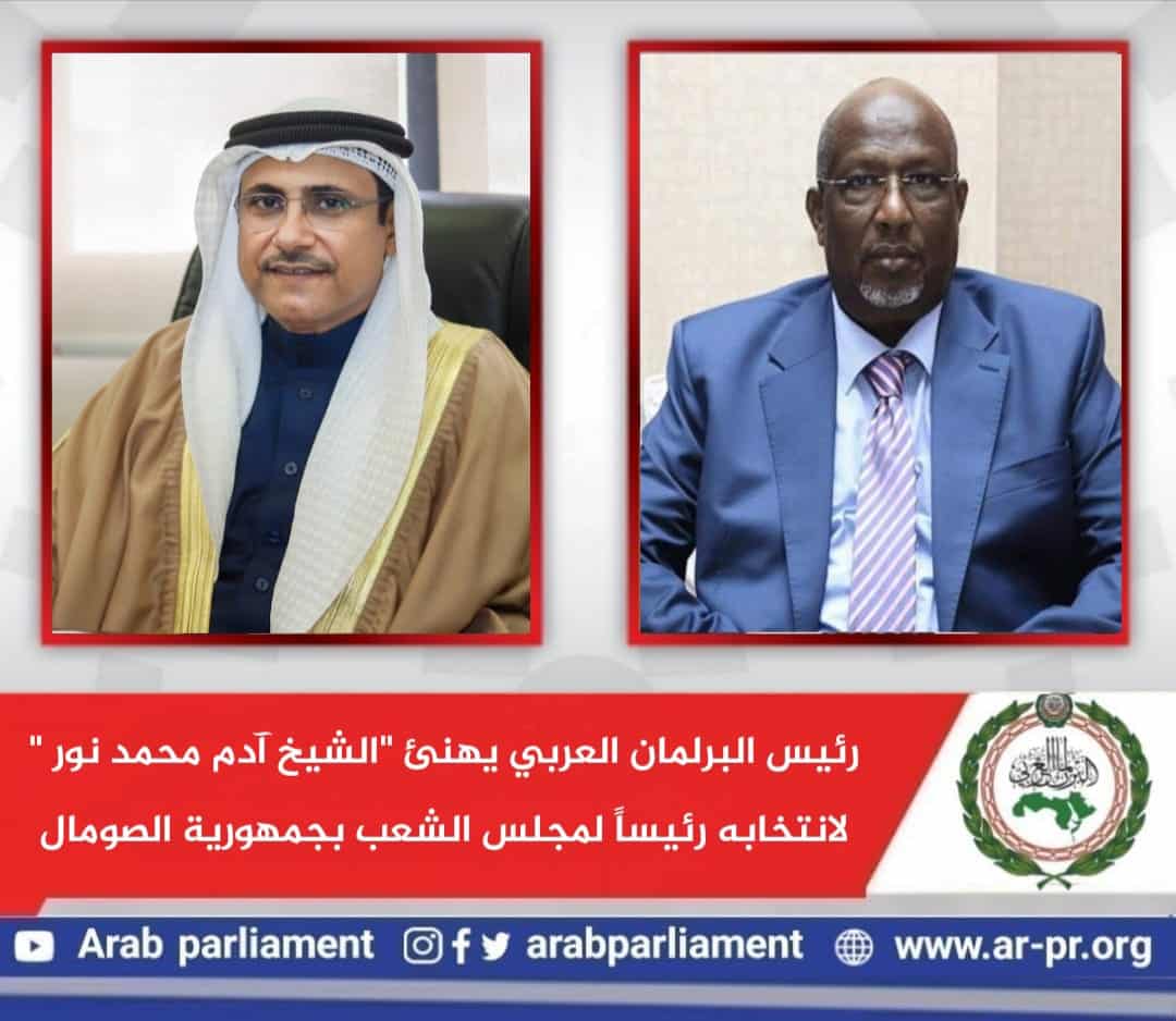 رئيس البرلمان العربي يهنئ “الشيخ آدم محمد نور ” لانتخابه رئيساً لمجلس الشعب بجمهورية الصومال