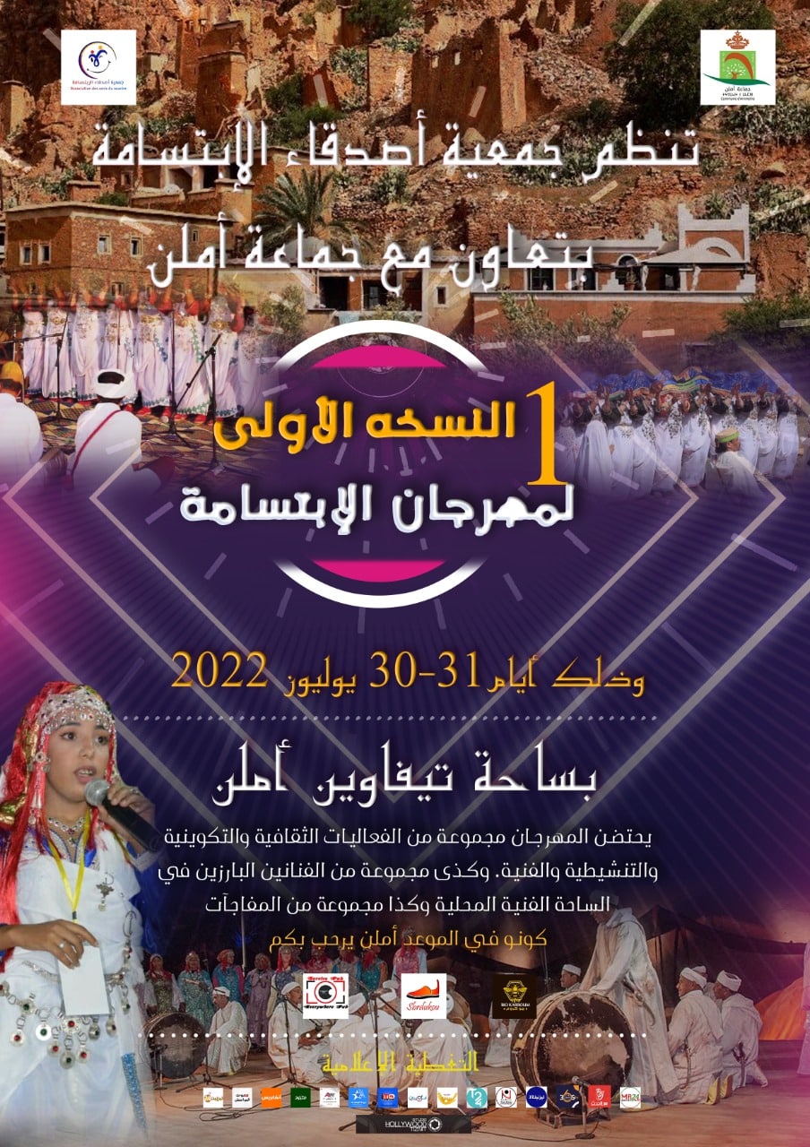 تحتضن جماعة أملن (تافراوت) جوهرة الأطلس الصغير، الدورة الأولى لمهرجان الإبتسامة وذلك أيام 30-31- يوليوز 2022 جماعة أملن تافراوت بعمقها الحضاري والتاريخي مهرجان الابتسامة السنوي الذي يحتفل هذا العام بدورته الأولى بدعم من جماعة أملن ومساهمة تعاونية كروم و أحذية سبردكو.