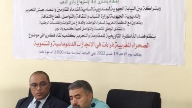 مجتمع المندوبية الجهوية للمقاومة بجهة كلميم وادنون تحتفل بذكرى استرجاع اقليم واد الذهبيخلد الشعب المغربي ومعه أسرة المقاومة و جيش التحرير يوم 14 غشت الذكرى الثالثة والأربعين لاسترجاع إقليم وادي الذهب التي… أكمل القراءة »